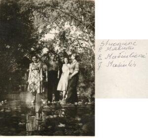 iš dešinės stovi pirmas Kazimieras Cvirka; antras Tomas Mačiulis, Tomo; trečias Pranciškus Šimanskis, Pranciškaus; ketvirtas Petras Mačiulis, Tomo;