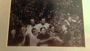 viduryje sėdi Marijona Šimanskienė/Ambrutytė - Pranciškaus, Broniaus (jos kairėje) ir Eugenijos Motina; Broniaus kairėje jo dukra Vida;