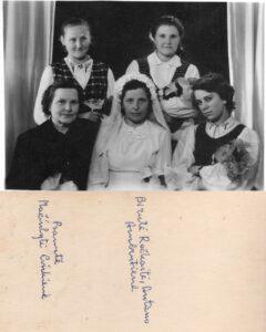 antra Anelė Rybelienė/Mačiulytė; moteris su skarele ir dvi mažesnės mergaitės neatpažintos; ketvirta beveik visiškai užstota Gražinos Rybelytės, Antano atrodo stovi Antanina Mačiulienė (Tomo žmona):