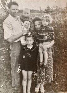 antra Anelė Rybelienė/Mačiulytė; moteris su skarele ir dvi mažesnės mergaitės neatpažintos; ketvirta beveik visiškai užstota Gražinos Rybelytės, Antano atrodo stovi Antanina Mačiulienė (Tomo žmona):